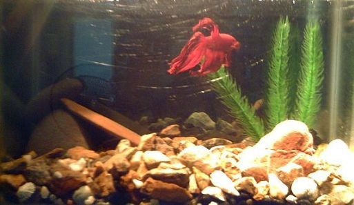 hi this is a pic of rocky my male simese fighter fish it is 2.5 UK gallons (11litres) notice his wonderful long tail he is a unusual red colour with purple stripes on his tail.he is making bubble nests so i think he is happy regards Jake