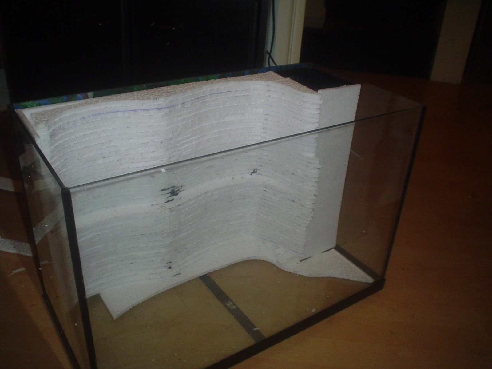 The cut strips are then stacked up along the back edge of the fish tank, alternating where the cut was made so that no two pieces are exactly aligned. This creates the strata levels in the rock work. In my first tank, the strips for the lower third were cur wider. This was to create a ledge along the length of the rock wall.