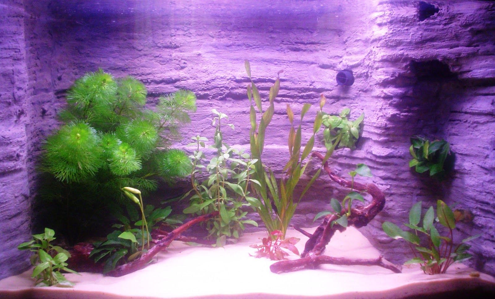 The area around the filter box was created separately but in the same manner,and blended in. Careful thought has to go in to the creation of the cave oin the right hand side which is located under an overhanging rock area. This cave is actually one of the water inlets into the top of the filter, and the diagonal 'crack' in the middle of the lower rear section is the second water inle to the heater. The filtered and heated water is ejected through the pipe poking through the upper right hand side.