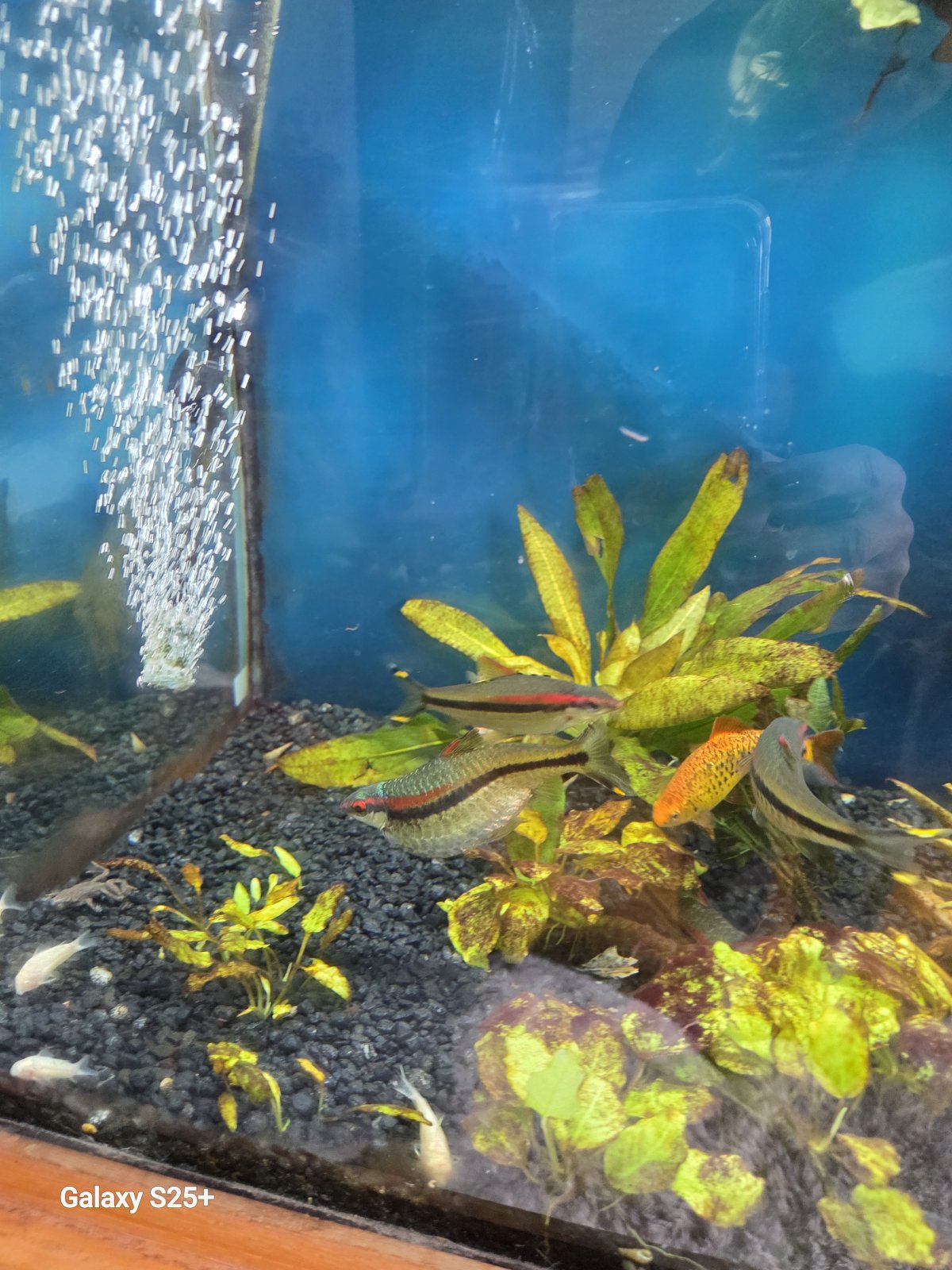 They are 5 years old, water perimeters are all normal levels. It's a 75 gallon tank with live plants. They eat flakes and frozen blood worms.