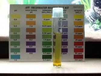 I can't really tell you (though the one in the 1st photo on the right (Aquarium water)looks ever so slightly greener but so does the one on the right on the second photo but you say that this time it's the tap water on right, You need to see the surfaces of the liquid in the tubes to be in the same light (there is every chance that you could have more ammonia in your tap water, I think water authorities in the UK are allowed to let water with ammonia at 0.5ppm get to our homes, your filter could process this out)