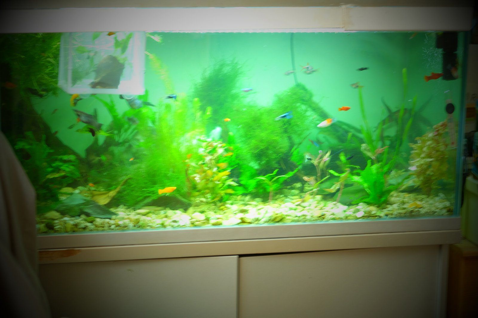 This one is an overstocked, livebearer nightmare, but I caught up a load of the fish to go to the LFS tomorrow. Still a crowded tank full of fry, but less overstocked now I've removed 30 odd young adult platies and mollies.
