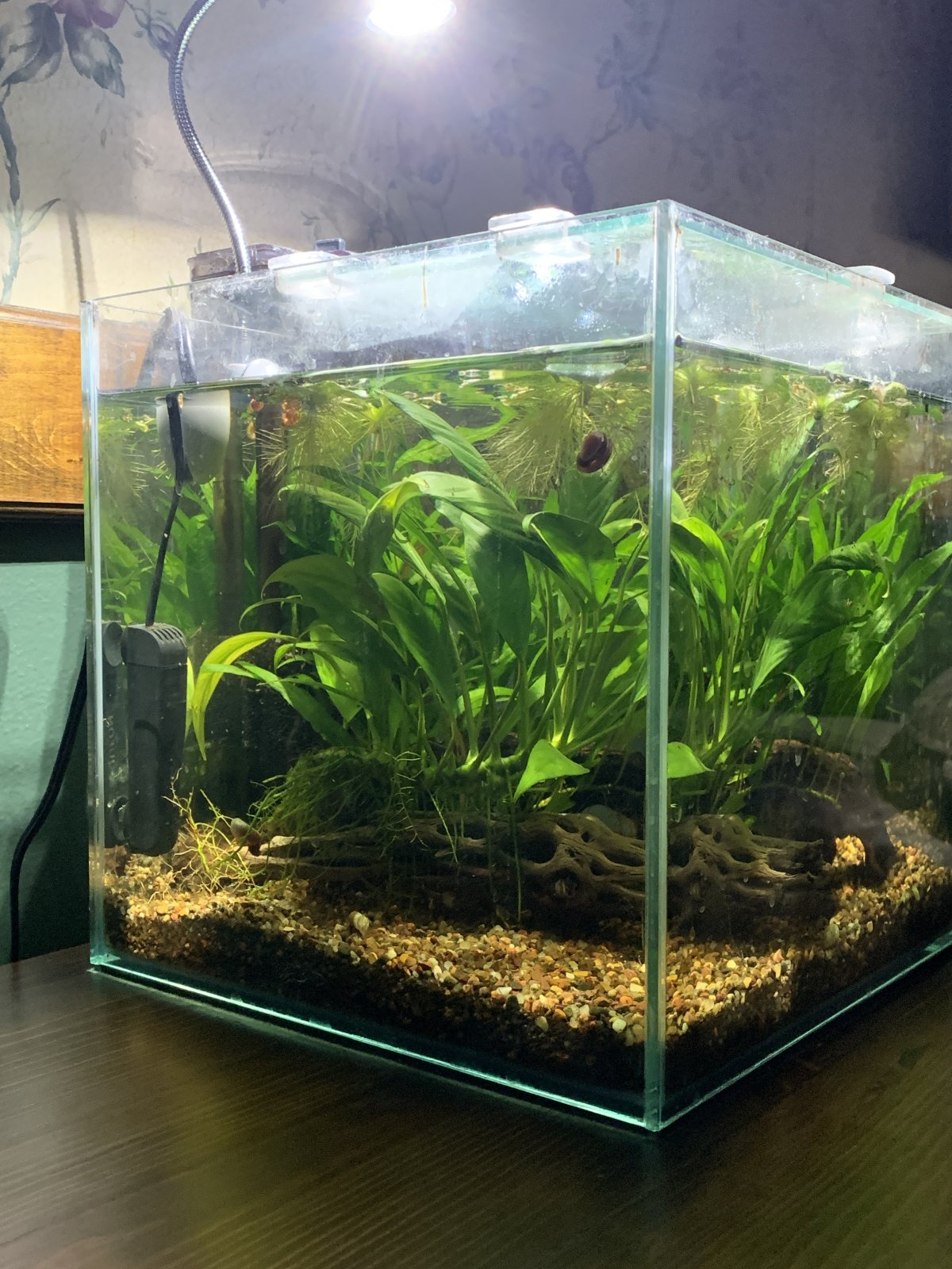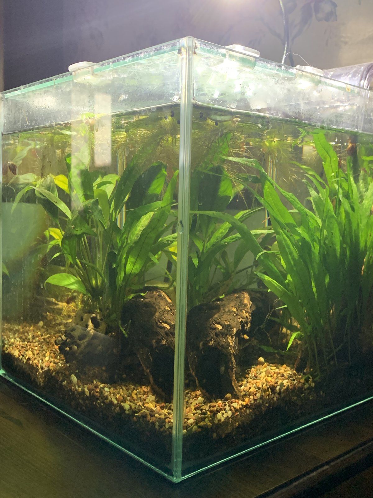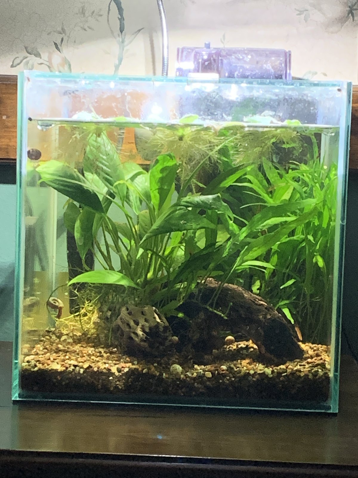 I currently keep 6 aquariums, and one of my 3-gallon cube tanks used to be home to some jade green neocaridina for the past couple of years so the tank is well established and has long been cycled. I'm down to just one shrimp left in there, along with some ramshorn snails that have not become overpopulated (I love the snails and keep them in all of my aquariums), so I am considering obtaining a scarlet badis. They will be anywhere from 0.3" to 0.5" when shipped, and they're not expected to get any larger than 0.5" when fully grown. The tank is 9" square and is well-planted (anubias, java fern, buce, and dwarf water lettuce), has driftwood pieces arranged into caves and tunnels, and has a piece of cholla wood. I've attached pictures of the little aquarium from various sides for scrutinizing.