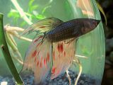 This boy is one I saw in a chain store and managed to resist the urge to buy him. When I went back a week later he was still there so I figured it must be fate. When I first got him, his fins were fringed with black and his body was jet black. His colors have changed since then. His tank is next to my monitor, and when I sit at the computer he comes and begs for food.