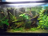 Also in this tank are two pygmy cories, which are breeding. I haven't actively sought to raise the fry, so they may be surviving somewhere in the java moss. There are also freshwater limpets, which I still need to research. Plants are java moss, salvinia, java fern, and a few plants that I haven't identified.