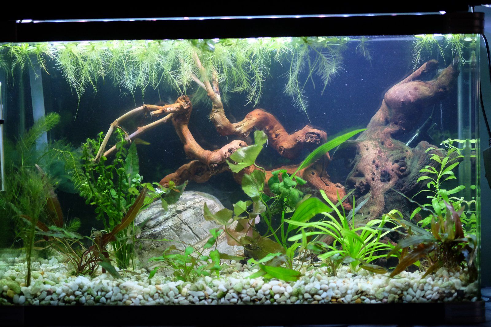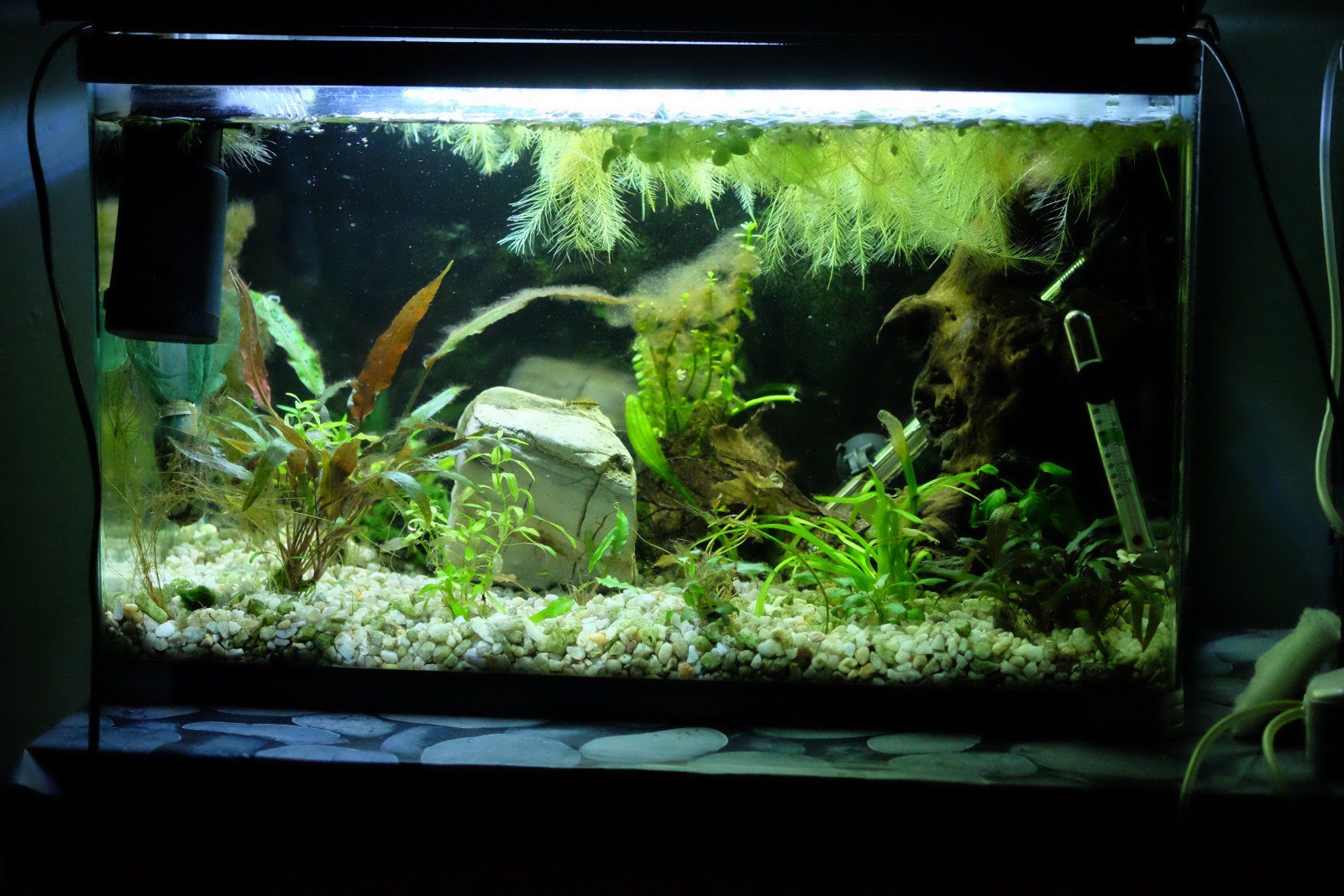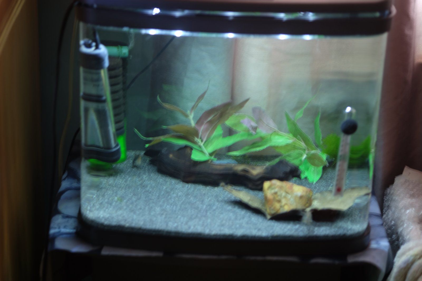 And I need to change extension cords so the internal filter isn't right at the front, so this tank is a state right now, what a difference a month can make! While my lovely tank went from practically bare to healthy jungle within a month. Constantly evolving!