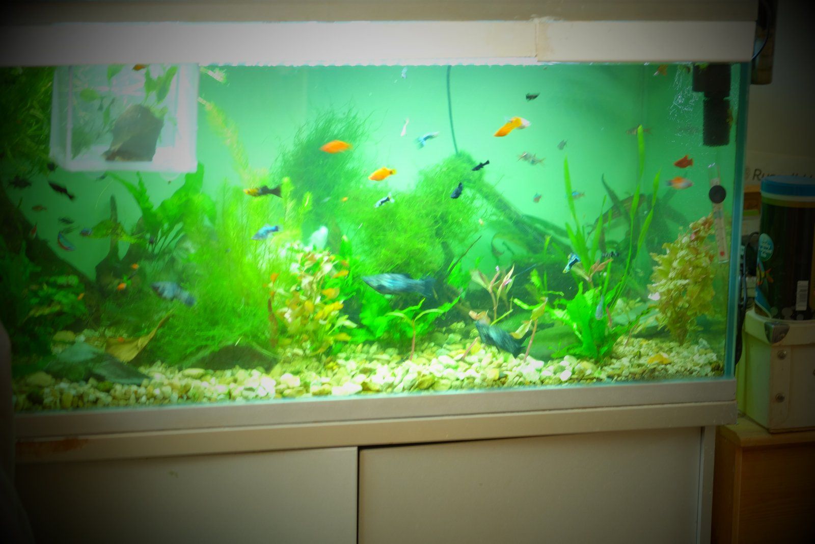 My dad's horror tank. I've improved it a bit by adding a load more live plants, but the ugly background colour he painted onto the tank, the ugly strip he stuck along the top to hide the waterline, gravel etc, I can't do anything about since it isn't my tank. Nightmare stocking too. Really, the whole tank and stand just needs replacing. Not a tank I'm thrilled to show off!