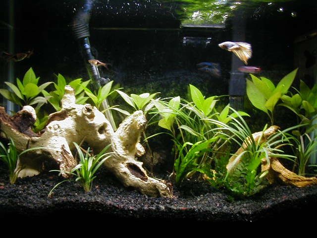 After looking at all the great tanks here, I was hesitant to post mine but here it is. It's my first 10 gal betta tank with 1 betta and 6 harlequin rasboras.