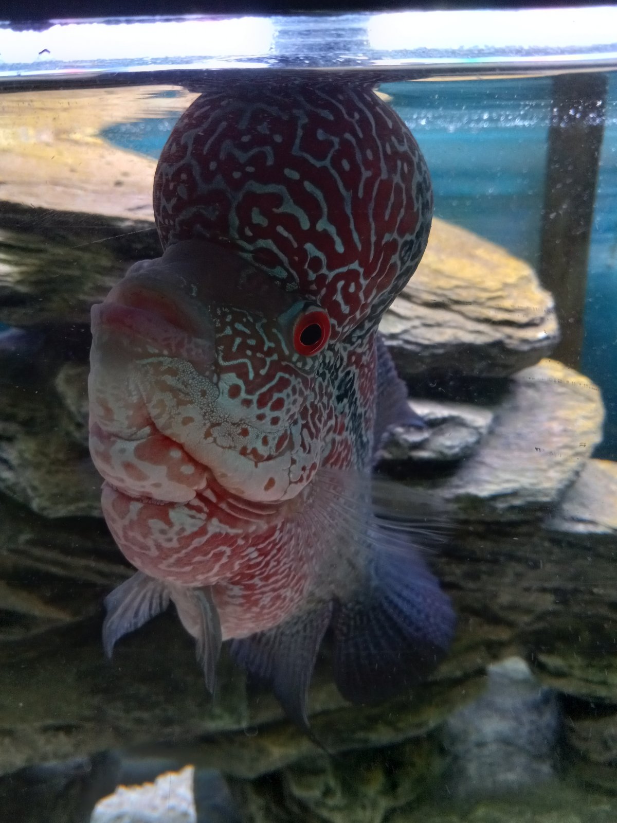 If you have a standard flowerhorn set up, then its a bare tank with no gravel or plants. The nitrogen cycle in such tanks is weak, and that pushes extra work onto the fishkeeper. Flowerhorns are big fish, and big waste producers. You can see 3 gallons a day isn't cutting it from looking at your fish. You're doing about 20 gallons a week, and look at the fish. It needs help beyond that.