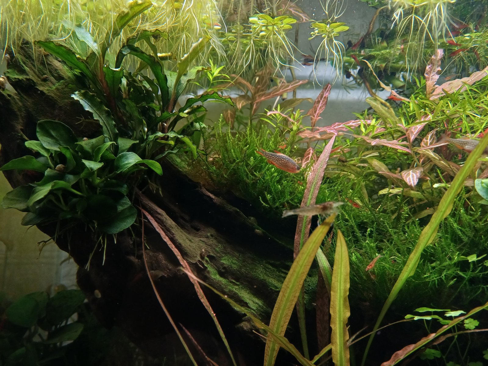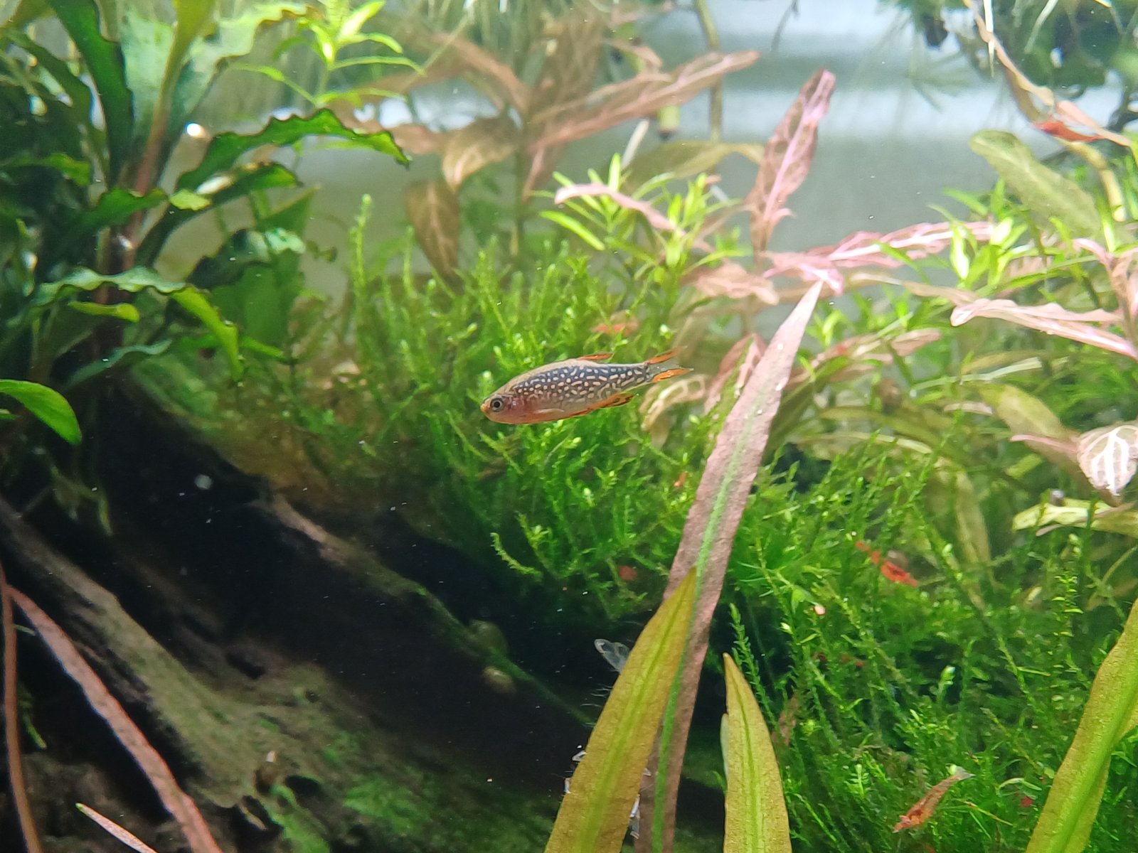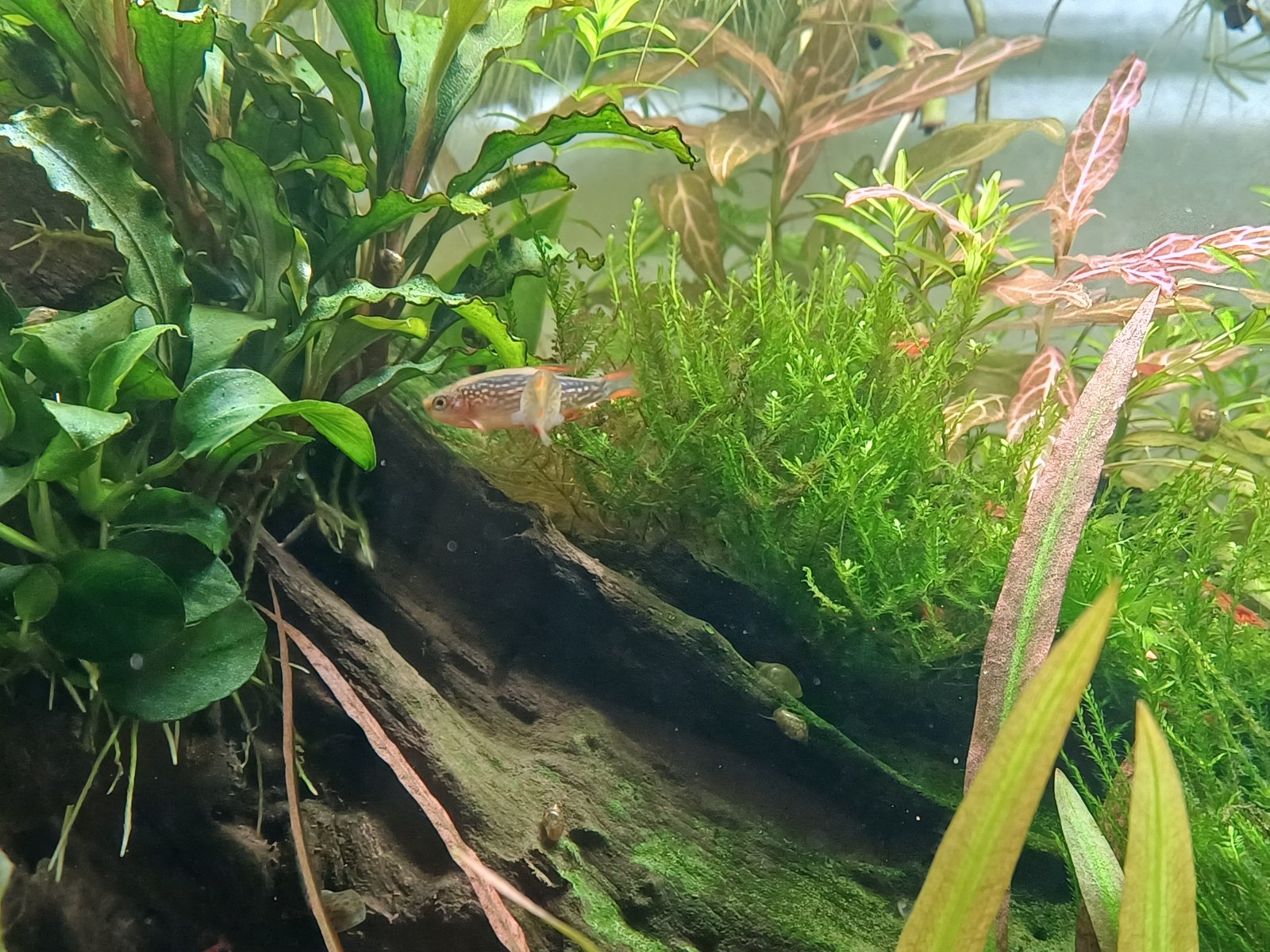 Hi everyone. My 12 gallon is coming along really nicely with a community of 10 CPDs 8 pygmy corys and lots of shrimp. I recently added a new male CPDafter my original "Paul" got himself stuck under a rock and died. The new guy "Bryan" has been here for little over a week and is very shy, his colouring is not as vibrant as the others and his fins are constantlt clamped unless hes courting the girls or sometimes when he eats. I cant tell if he is sick or just stressed.