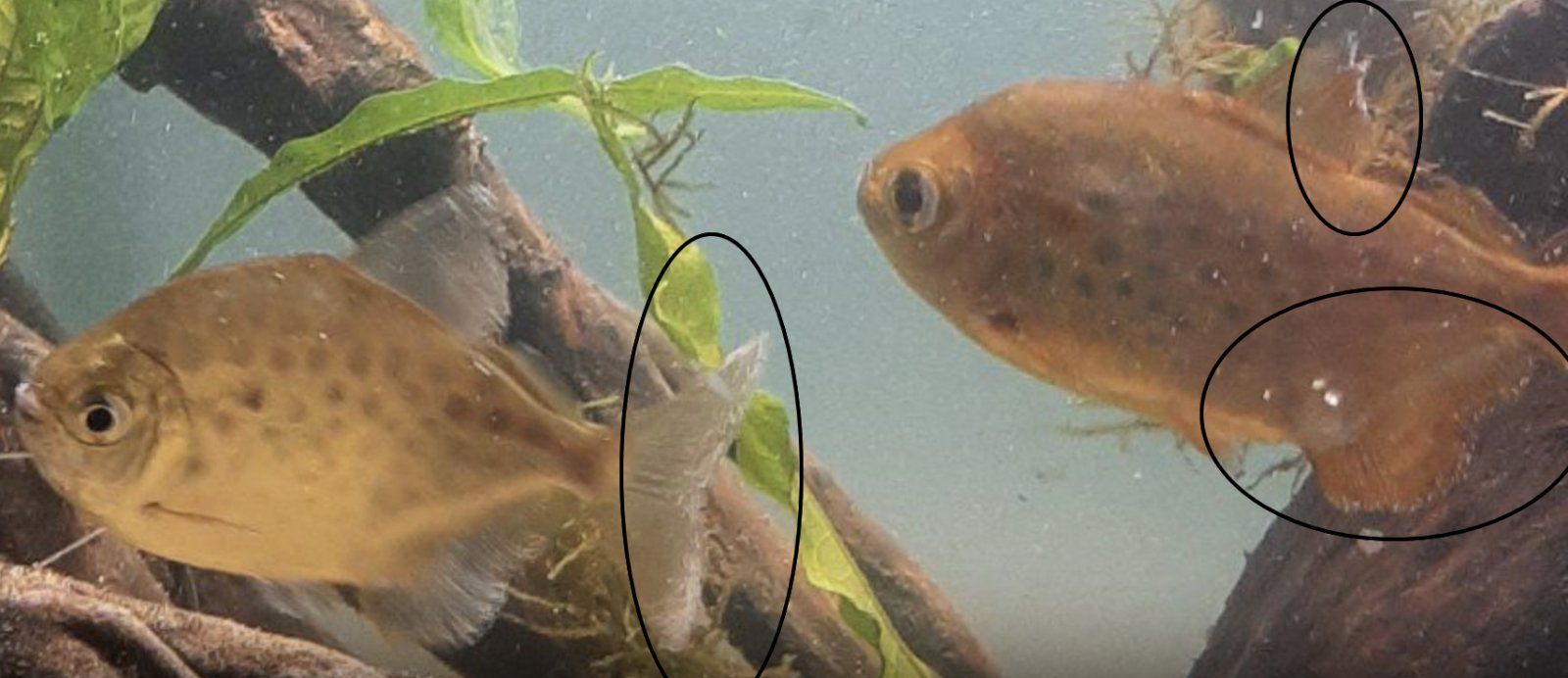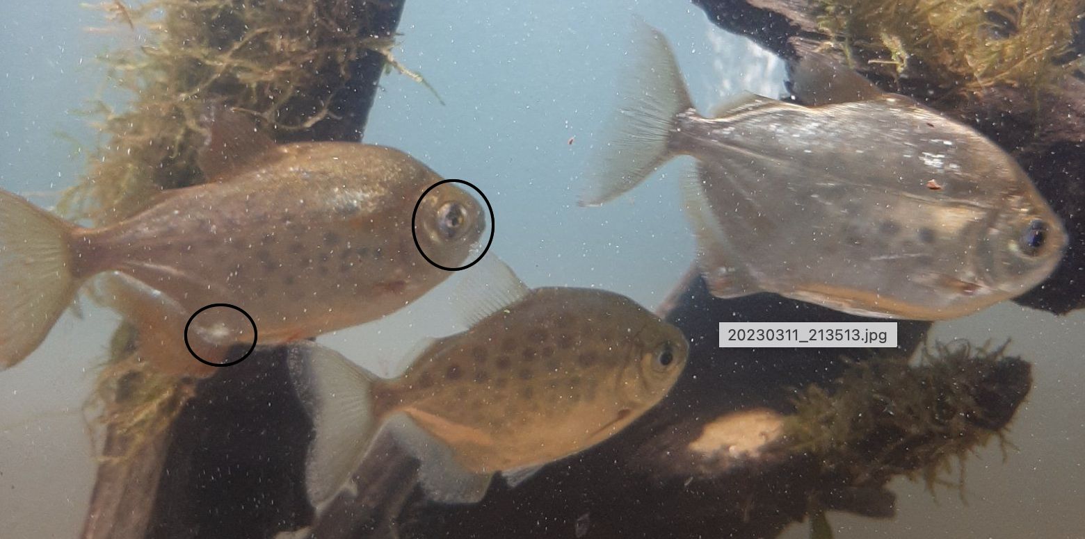 As for the frayed fins, the one with what you said is a swollen eye has frayed fins, I believe it is injurys he sustained in a water change, although I could be wrong, as I only noticed it a few days ago. I've never seen the Rosy barbs pick at the dollars but it'sof course possible I've just been missing it. I don't think the patch by the anal fin of the same fish is anything concerning, he's had a mark there for years, like his sales reflect the light differently.
