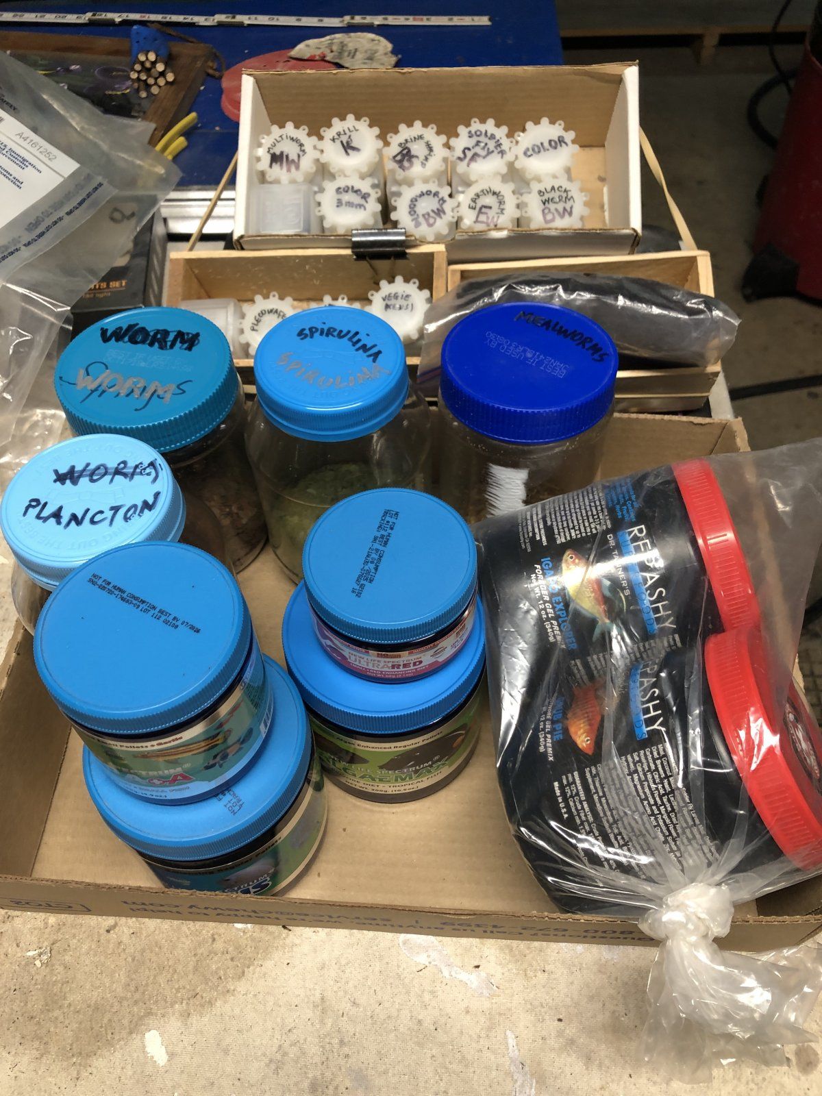 On feeding days, fish 2 different items out of a long list of rotating items, including: Flakes (3 kinds), pellets (12 kinds), frozen (4-5 kinds), Repashy (2 kinds), earthworms (I keep a culture), dry meal worms, garbanzos. For silver dollars, in addition to above, I include sunflower seeds in the rotation. Sometimes I use cucumber (rarely). For commercial brands, I keep NLS (small pellets), KensFish (pellets, flakes & discs), Repashy, and Hikari (frozen). I also make a mix of several varied flakes, pellets & discs (ground with a dedicated coffee mill) that allows feeding large size food to small fish. I keep the stock of each kind frozen, and smaller amounts ('my stash', photo), in a refrigerator, for regular use.