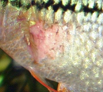 Does anyone know what is wrong with the skin surrounding the pectoral fin of my male pearl gourami? The area seems to have lost the scales and has the appearance of inflamed tissue. I have included some pictures with one of a close-up of the affected area.