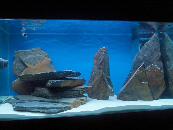 Here is my tank with slate, not so many 'caves' but i like a lot of open water space for my fish. I tend to use large pieces as well but its all a matter of personal preferance.