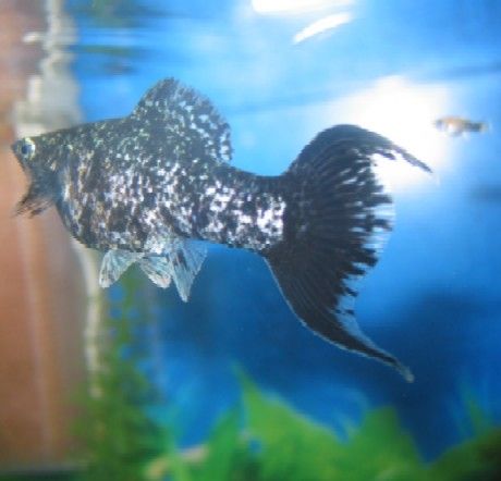 well, over the weekend, my BIG female lyretail molly, Big Mama, died. she'd been a little lethargic all week, and hiding a bit more than usual. i kept an eye on her. on friday, on our way out the door, my boyfriend checked on her and noticed her one eye was swollen and protuding. i was going to pick up some stuff in the morning, but we found her behind a rock, dead, saturday morning.