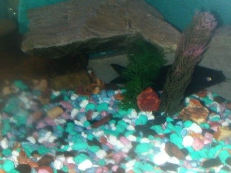 He is my most favorite tank inhabitant although much to my dismay these are the best pics I have ever gotten of him they do not do him justice he looks like black velvet and he is so laid back he actually LAYS <not float LAYS> in the hole of his driftwood.... if I take the driftwood out he gets very mad at me.
