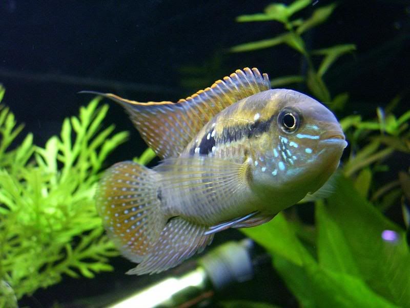. Anyway in another tank there was this lil guy, and he was begging me to take him home, I could just see it in his eyes LOL, so me being me I bought him LOL. He's still settling in now, got a bit bullied when I first added him so all aggressive occupants have been removed to fish bowls, while my new O settles in LOL. Right now he's sulking in a corner, I've named him Pendragon, to match Morgan Le Fey the Acara that lives in the same tank.