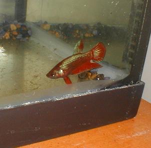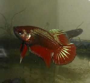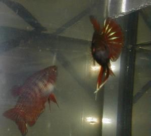 Not sure if they're sexually mature, but female seems to have some eggs (I don't want a huge spawn) and is showing nice vertical barring. The male has built a bubble nest. I released the female today as both seem to be in excellent condition (and I've heard some success stories of bettas spawning easily soon after shipment). The male is currently frantically squirming his body for the female with his fins fully flared (he's a SD when fully flared).