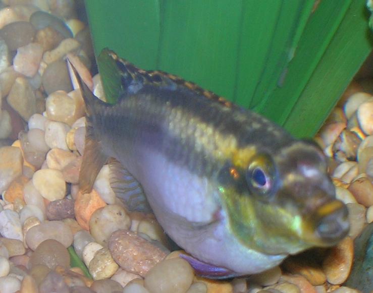 Well it looks like there is somewhat of a dent in the head and its a whitish color in the dent. there is also something on her scales on the other side of her looks like a very small sliver that is dark. I just lost the other krib to columnaris, and if this is a bad disease i am gonna throw her out too, i currently have three rummy nose tetras in the tank who look healthy. If I decide to throw her out. what should i do with the water to make sure its not gonna affect my other fish. I will restock it wtih some of their fry from before.