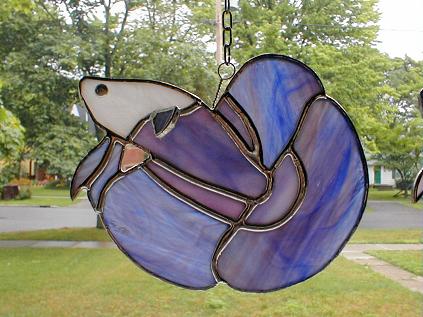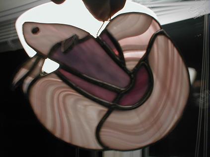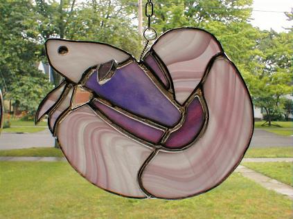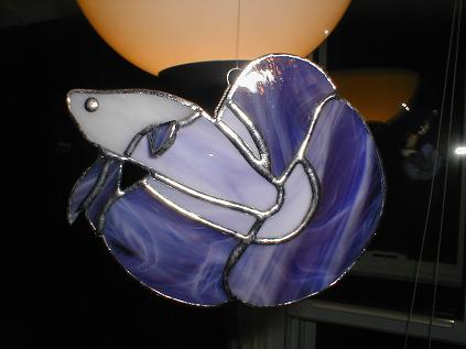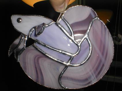 Hi. Okay I have two stained glass bettas for sale. They are two variations on the same pattern. The first one has a pinkish/purple body with a very interesting blue/pink/purple swirly finnage. The pectoral fin is popping out of the body in 3D fashion. The head is a very light pinkish/white colour and the eye is solder.