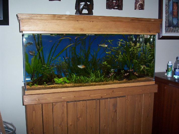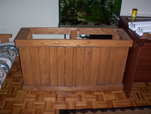 Here's a pic of the stand & hood I built last February for my 65 gallon. Used the garf plans to build the frame, & skinned it with finished one side plywood, had no plans for the hood, so just had to wing it.