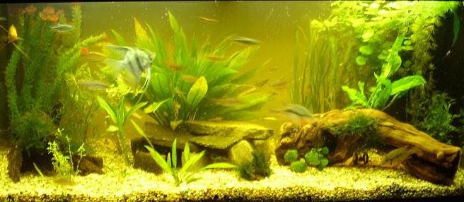currently has a m/f firemouths, golden and pearl gourmais, shoal of congos, golden barbs, ozola barbs, male krib, rams, one angelfish, group of cories, syndontis eruptus (7 inches) and my pride and joy royal pleco and two bala sharks, i know the balas will out grow the tank but they are my excuse for getting a new larger tank when they need it. also have a hillstream loach, had four but disapperaed recently