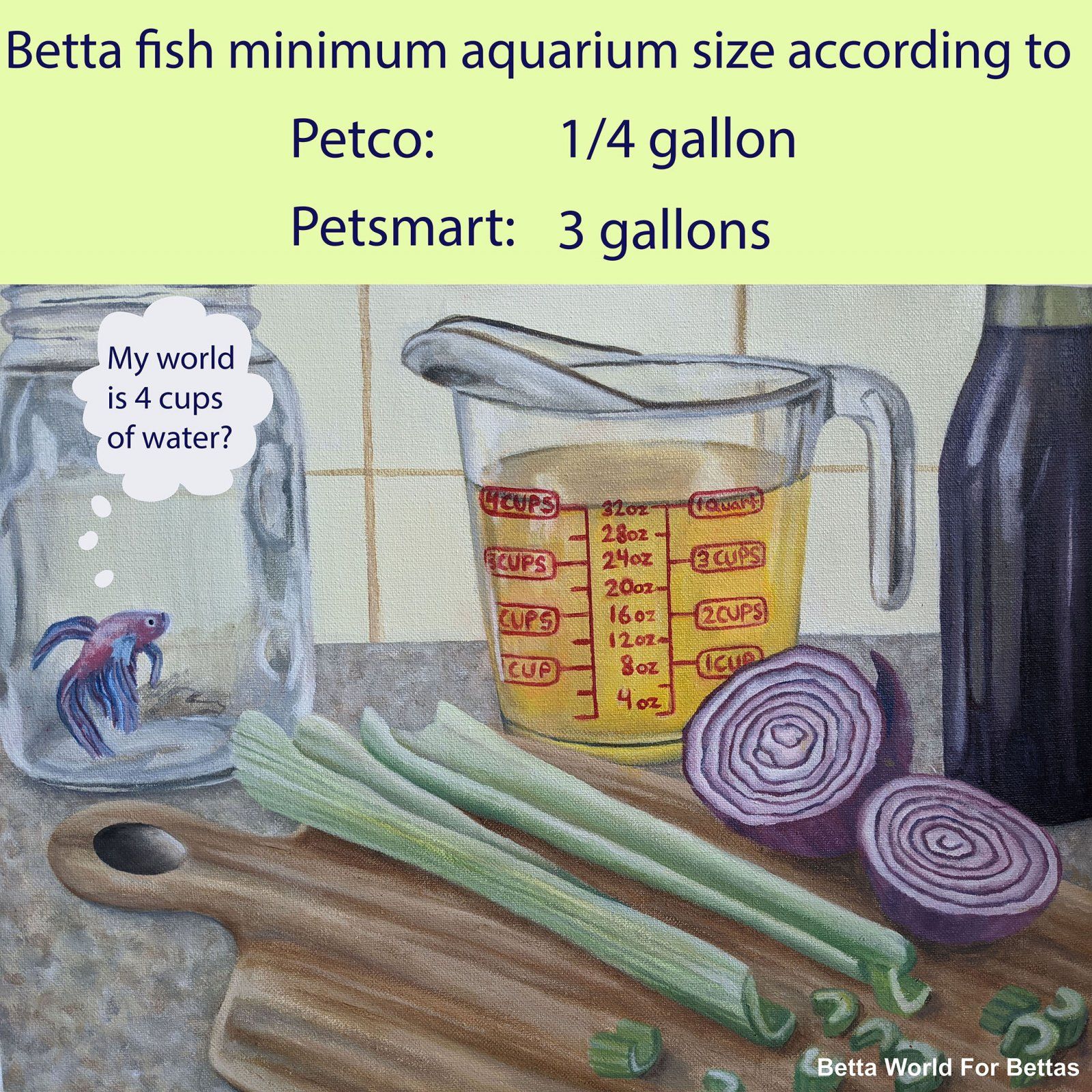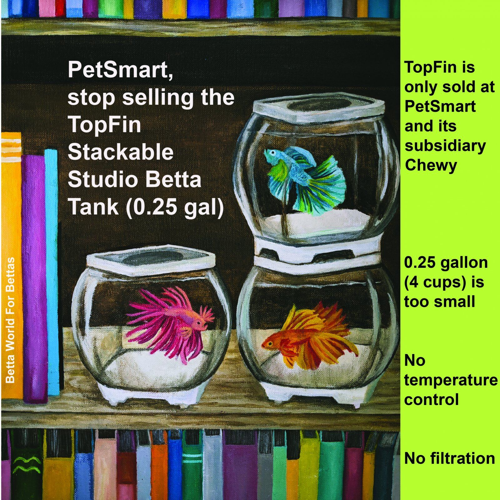 I've started a project called Betta World For Bettas, because I see there's still a lot of misinformation about betta care among consumers and pet chains. I've been working to address these misconceptions through acrylic paintings and social media posts.