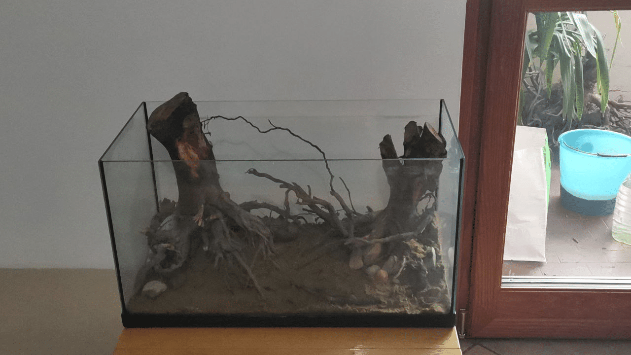 Tank is 60L, with the hardscape in the photo, it's alder wood, some rocks and super-fine sand (like a tenth of a mm) taken from a well, and some leaf litter on the bottom. Considering the wood and the leaves, the water will be slightly yellowish, but we may revert that with some activated carbon.