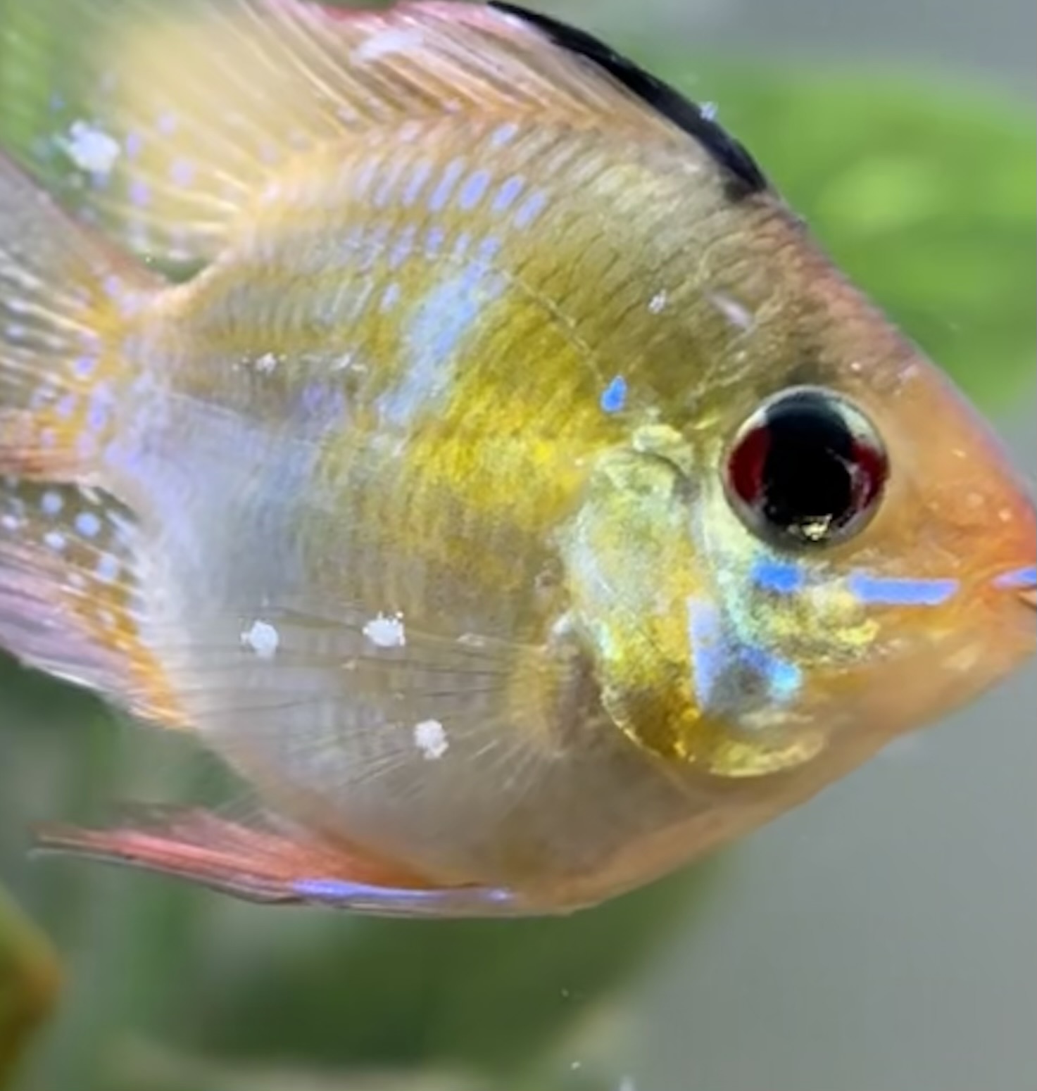Hello, recently I purchased a balloon belly ram. And like the look and personality of the fish very much, however I noticed about a week or two ago that it had some white spots on its fins and body…. I immediately treated for ick because it is in my community tank… however on further inspection I don’t believe its ick, and Ida not visibly spreading to the other fish. but I have no idea what it could be, it’s unlike any fish illness I’ve dealt with before, also I’ve noticed some of my other fish scrubbing on the gravel which is abnormal, however no sign of these “spots” on the other fish. The only other thing I’ve noticed out of the ordinary are some what I believe to be(rhabdocoel flatworms) gathering on the glass. Any ideas about these “sores”
