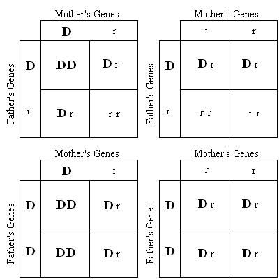 for example, in the first Punnet, two Dr genotypes are crossed. this produces 25% DD, 50% Dr, and 25%rr.