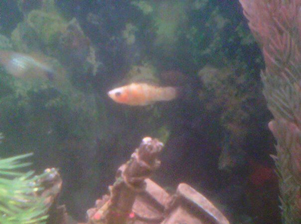 kind of a bad pic taken off of my blackberry. he has a real mottled color pattern, but where as the rest of my mollie platy and swordtail doral fins are short lenth wise his runs from just behind his head to the start of his tail. and his tail is a little longer then the rest of my mollies and platys. could he be some weird hybrid?