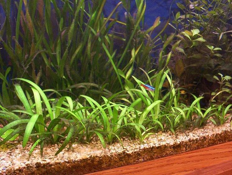 Neon tetra in the grass, looks like there aren't any other fish in the tank, really there's about 11 of them in there hiding..