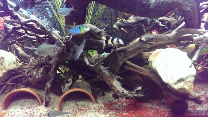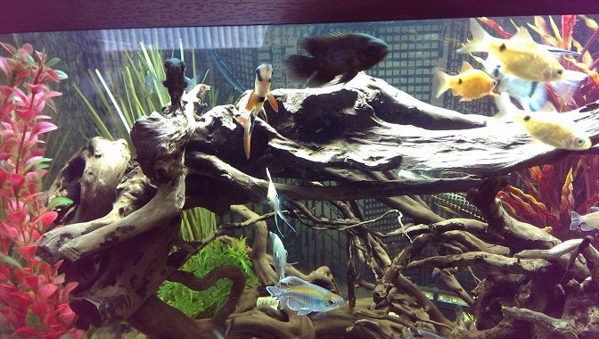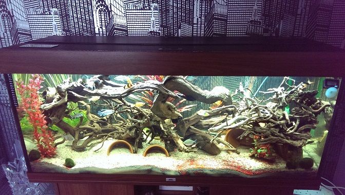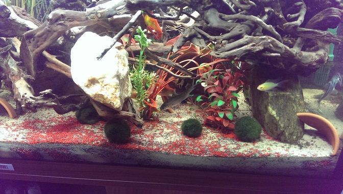 Here is a couple of pics,one with the rocks i had in to keep the wood from floating,and the other without them i think it looks better