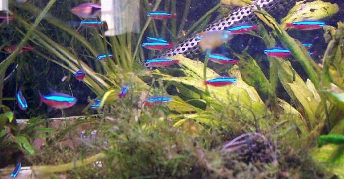 Now it just has one of the kribs (as he is still looking after fry), a couple of bristlenoses, a small shoal of harlequin rasboras, a larger shoal of cardinal tetras, four threadfin rainbows, some bronze corys, some otos and a couple of botia striata. A lot of these came from two smaller tanks that I had, one at home and one at work.