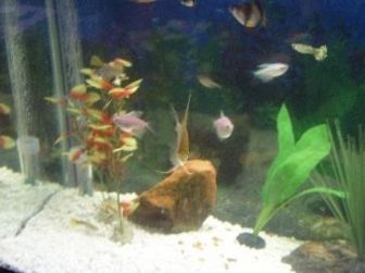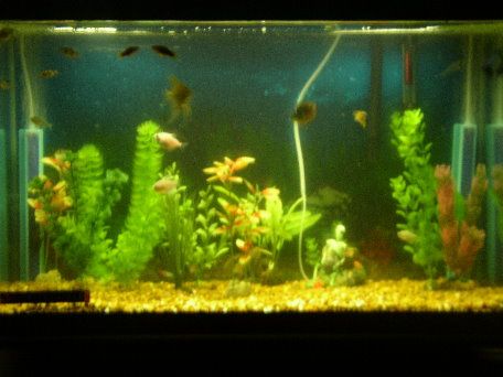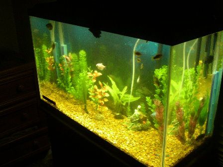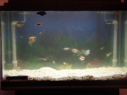 My tank has been completely changed! Some of you may have herd of me redoing my tank from last weeks threads or some time around there. I took out my nasty brown gravel and boy was that nasty! i thought i got everything when i sifted the gravel once a week. Turned the water pure brown! i couldn't even see my shiney angel! i isntantly put in the filter an then noticed my baby plec was under it and boy was that a chalenge to get him out! Once he was out a guarami desided to expload and eat all the poop he wanted! Then a quick tap of the glass and boink he was out. The tank stayed without gravel till about 8pm. This morning the water was so much cleaner looking! Then i got the names of the plants i want and im headen down to my LFS tomarow to give him the order. Ill show before and after pics in the morning tomarow.