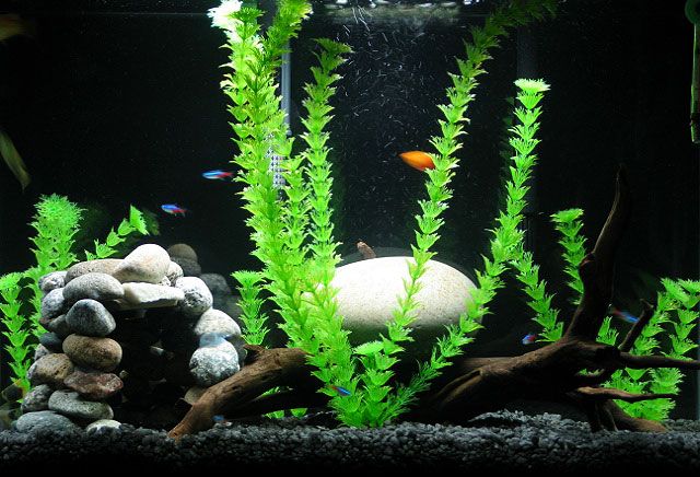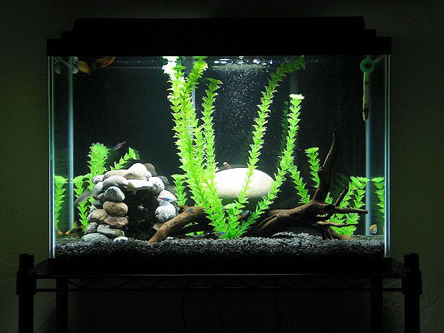 Move the egg shaped rock to where the small plant is on the right, put the tall plant in the back where the egg shaped rock was and put the small plant where the tall plant was. It would look better imo because the rocks would be at opposite sides of the tank for a more spread out look. Then it's a general rule to have tall plants in the back and smaller in the front. I think it would look good. Just my opinion though. Looks good the way you have it!!!!
