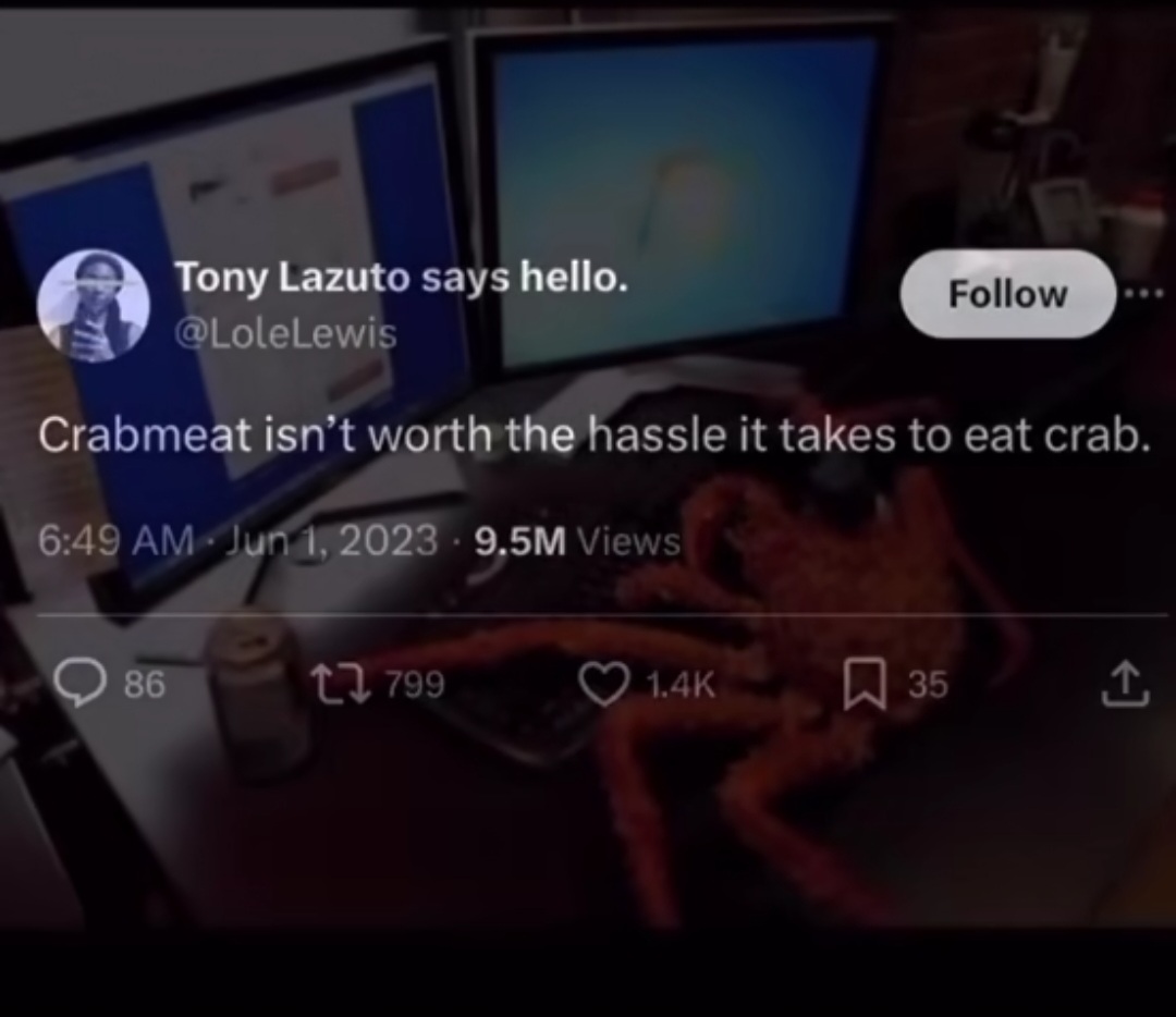 Personally I couldn't care less for either crab or lobster. To me both are pretty bland and tasteless and just something to dip in flavored butter. It is like me and Filet Mignon which I also don't care for. If you have to wrap in bacon to have any flavor it just isn't worth the price.