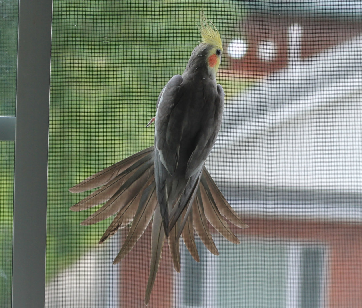 Here is a small example of how he was initially treated. In front is in what he previously lived. In back is his current home. In this photo the cage is not finished as to what he has to mess with. To give perspective the dark back cage is 3X3 feet in depth and width and 4 feet tall. I consider it totally cruel that he spend, probably around 2-3 years in the white cage. I've done the best that I can. His first cage was like putting a beta in a quart of water which many do. Second image is more like how he is out of his penthouse. Third is his catching some sun on my window screen. May be a 'head case' but sure is a pretty bird.