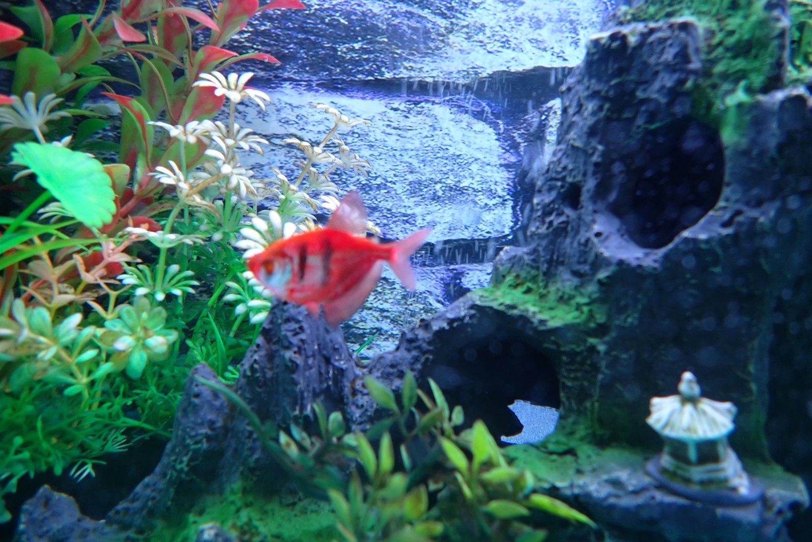 I found this fish at a local dealer, swimming in a large tank of widow tetra glofish. The dealer insisted that it is "just a red glofish," but that is clearly not the case - 'red' glofish I have seen are generally a pinkish-orange color, not the deep red of this specimen. This one also has the vertical stripes which are common in widow tetras, which are absent in glofish.