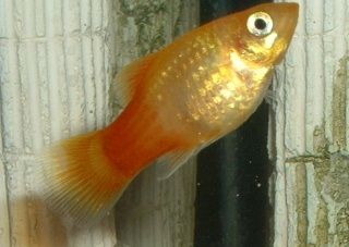 Here's my female platy Sundance! She's the greatest poser in my tank and loves the camera! And . . . she's pregnant! I can see some tiny black dots which are the fry's eyes in her belly.