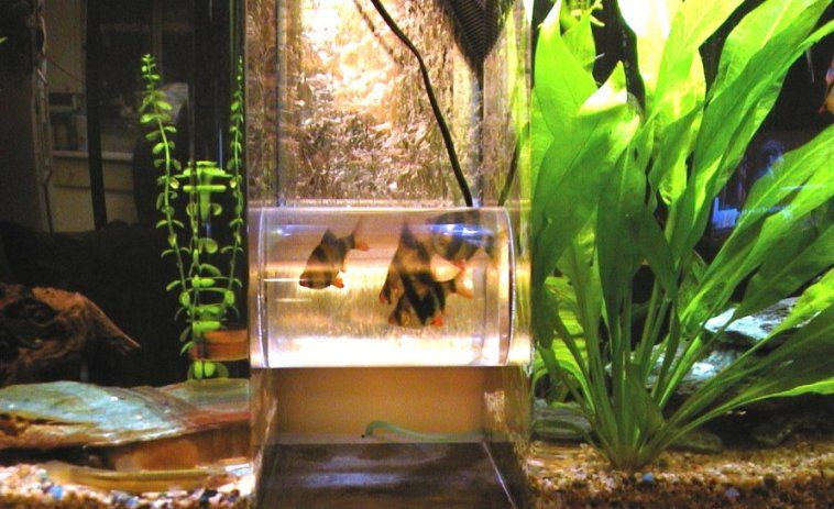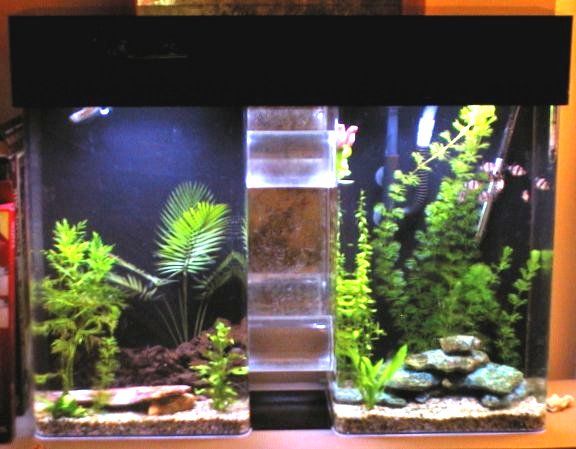 I only have one for now, but I am getting more as we speak so that I can give you multiple views. It's little dark, but that's the only way my camera would pick it up. Anyways, enjoy. And the bubbles coming up between the tanks are from a bubbler I bought at spencers with fake fishies in them. It sits in front of the tank (THe picture is from the back because I couldn't see the tiger barbs otherwise and there was bad light...lol sorry so blurry).