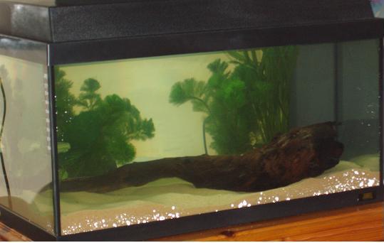 Current contents sand, 4 live plants- I know no details, just went to my supplier and said gimme 4 REAL easy ones, and a large dramatic piece of bogwood full of inviting holes!!