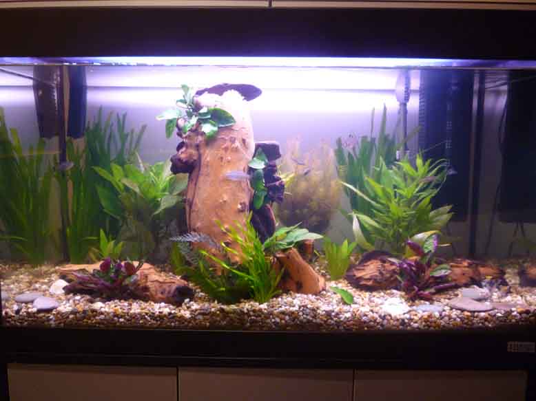 Started with the standard running equipment that came with the tank lights heater filter etc... some plain beach washed medium gravel and a few bits of bogwood from the net and some basic plants.