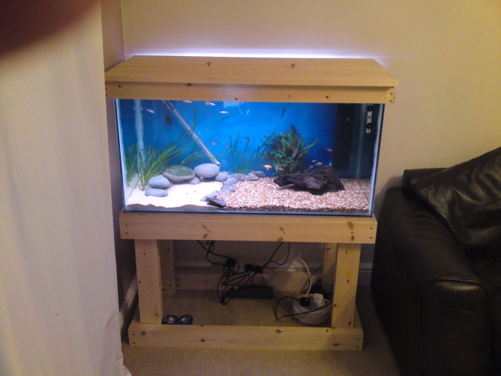 hi all, i did post a couple of months ago saying i was doing a journal and was going to be posting pics at each stage of the building process. well that didnt happen as we moved house and so i didnt have the internet. ive just got it back on today and so thought id post a finished picture of my self buily tank, stand and hood. its around 250l and only cost me about £70 to build the whole thing.
