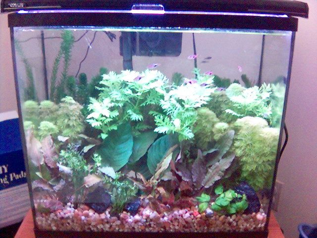 I also took the opportunity with a few extra bits and pieces of java fern and surplus tank supplies to set up a 1g lighted tank with one of those small kritter keeper filters. I don't know what it'll house, probably nothing. It cost me nothing to make, just had the stuff lying around. I may use it as a hospital tank or an isolation ward, since I can't treat my planted tanks with meds, and java fern is easily available to replace any lost through med treatment. It's not the best place to house a betta, too small, IMHO, but it may be a good temporary home if I find something really special. I just have to remind myself to feed it also, as the plants need some nutrients to absorb.