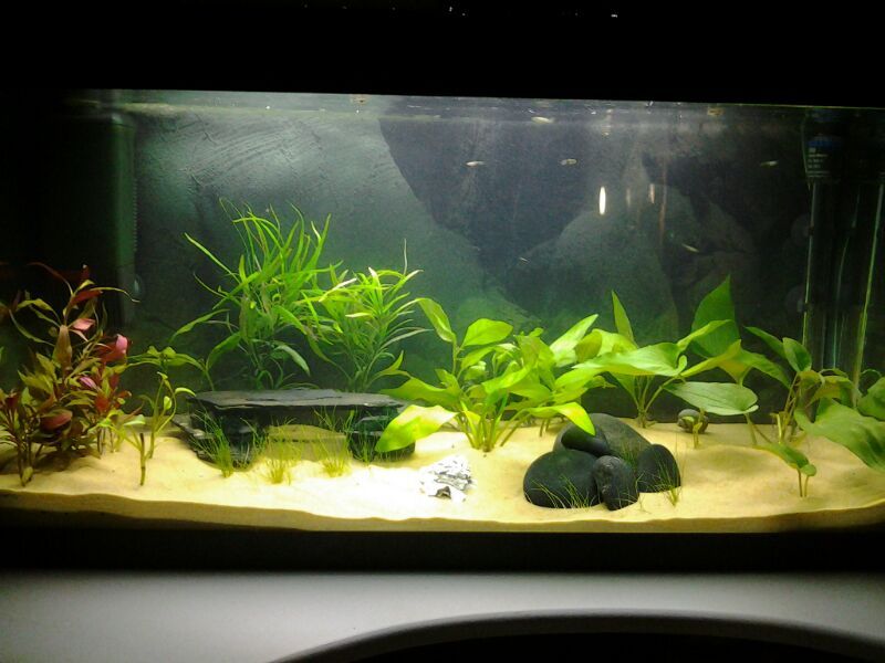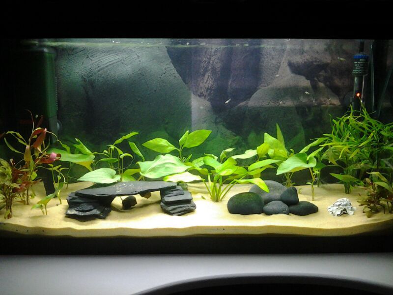It's very nice. I'd probably slope the substrate back to front, and a little side to side. Differing heights adds extra dimension to the scape. Also, bumping back the cave and rock formation a bit (and elevating one of the above the other - I'd suggest the rocks) will give the tank a bit more of a "feel". Tall plants in the back, like vallis would be nice, and maybe some moss on the cave to 'blend' it a bit.