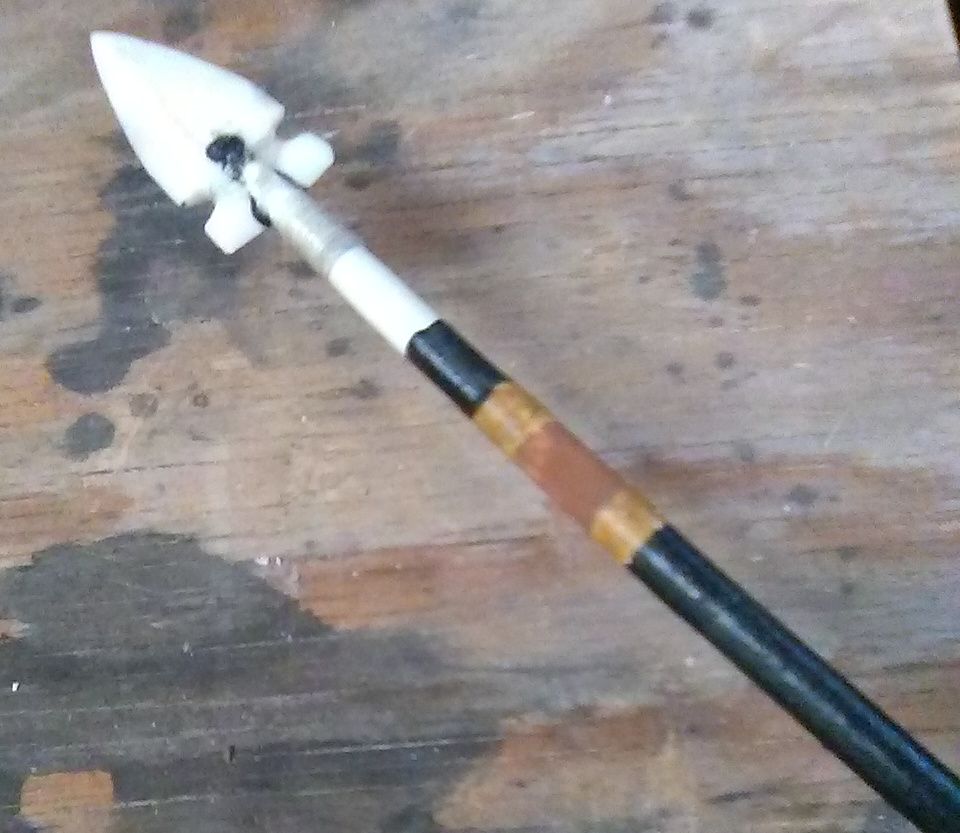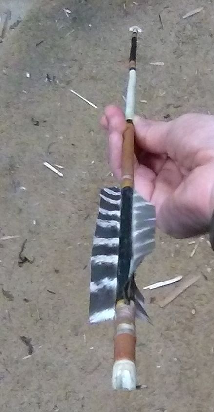 Very impressive!OK, here's my first attempt at a completely "primitive" arrow. The shaft is a red osier dogwood shoot from up in the canyon; feathers are wild turkey primaries from the Bighorn mountains. I carved the arrowhead from bison leg bone. The whole thing is held together with bison sinew, hide glue, and pine pitch glue, and painted with mineral pigments with egg yolk or hide glue for binder.