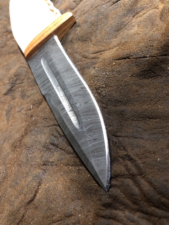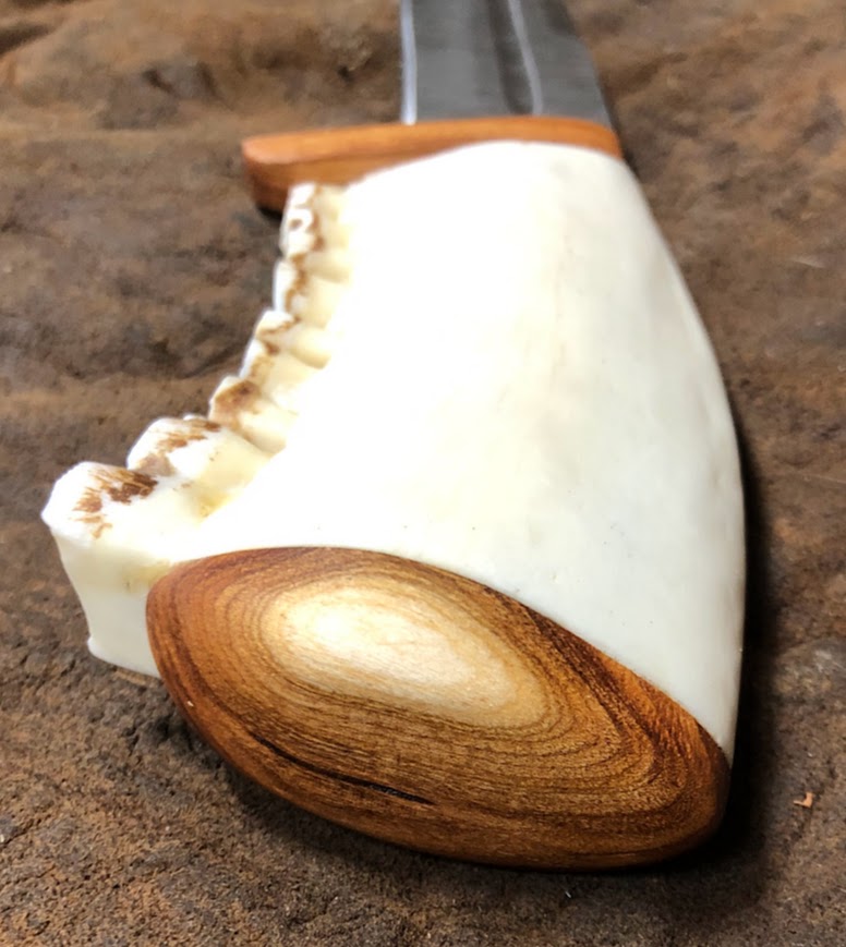 Thats a beautiful knifeJust finished a seax-type knife. Elk jaw handle with chokecherry wood cap and guard, finished with beeswax/pine pitch. Blade is damascus steel, purchased off Etsy. I sort of keep my eye open for good deals on blades like this. Yes, it's very sharp.I really love chokecherry wood; beautiful stuff and really hard and durable. There's no stain on this; that's the natural color.