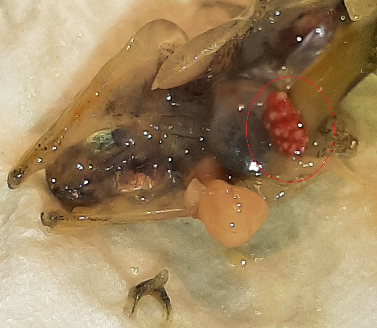 Sad news. My Psychopathic Stickleback died. His mouth was wide open, so I suspected parasites had restricted his respiration. I did a discetion and in addition to fleshy protrubencies in his throat, to my amazement, I found a bright orange organ, filled with little white spots. I looked jusr like a roe. But this was a male and I'm not aware that Sticklebacks are parthenogenetic. Any expert opinion gratefully received.