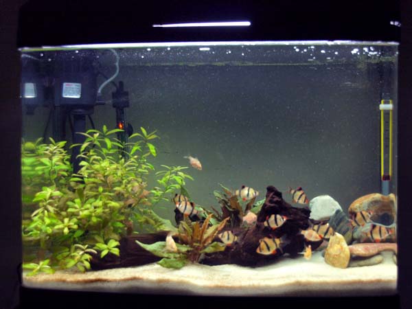 The general goal is to create a lightly planted tank, with several caves fit for breeding Kribs and to provide an attractive dither fish for the Kribs to feel safe (I dont really class Tigers as dither fish, like neons, but feh, you know what i mean). I dare say i will also boost the Tiger numbers up to 20 in a few weeks time. For those who feel this might be too many, you might be right and if i start to feel the same, they will get a home in the 240litre before reaching maturity.